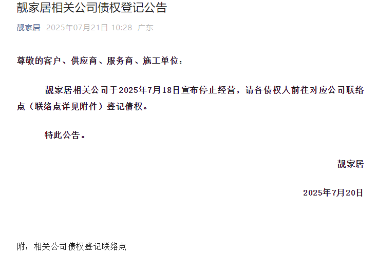 靓家居颁布发表遏制运营、破产清理取登记债务,可是无法于活不下去要退出……”的感伤。